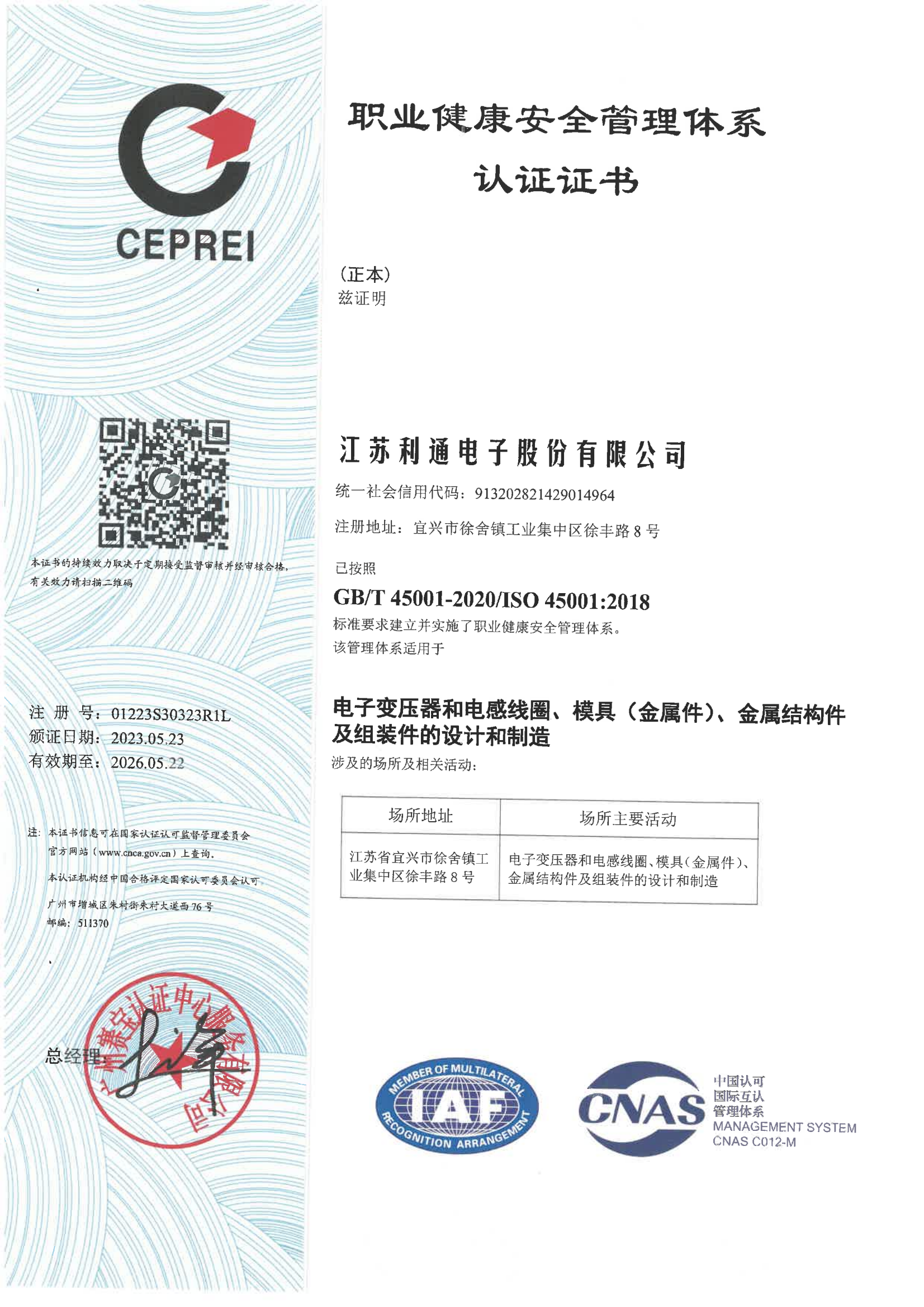ISO 45001 职业健康安全管理体系认证证书
